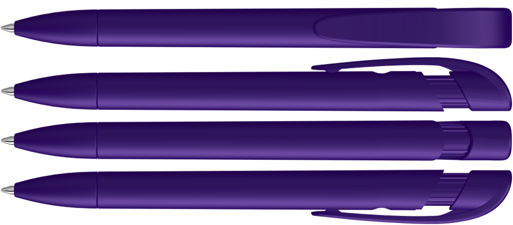 Druckkugelschreiber mit gedeckt mattem Gehäuse, breitem Bogenclipdrücker und Spitze.