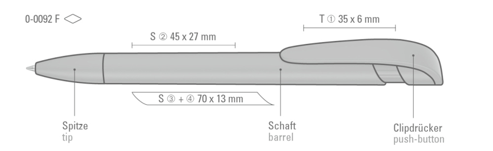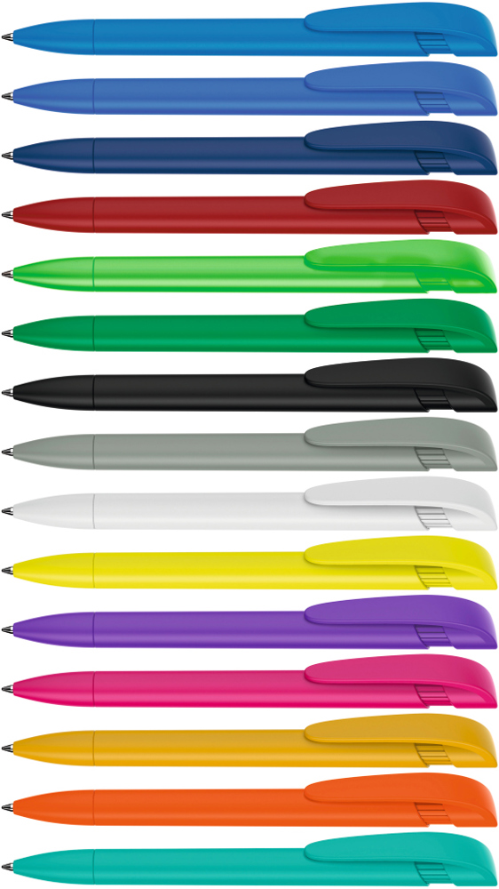 Druckkugelschreiber mit gedeckt mattem Gehäuse, breitem Bogenclipdrücker und Spitze. mehr