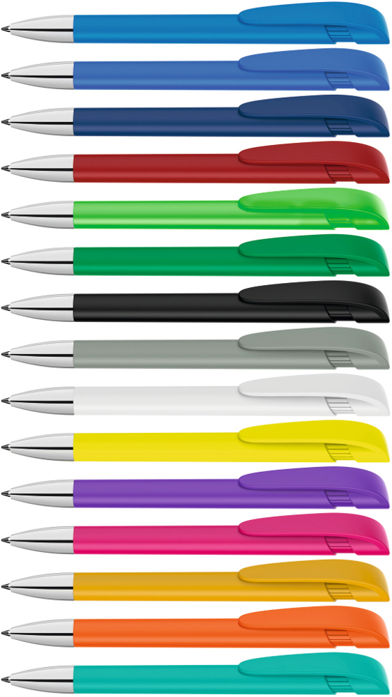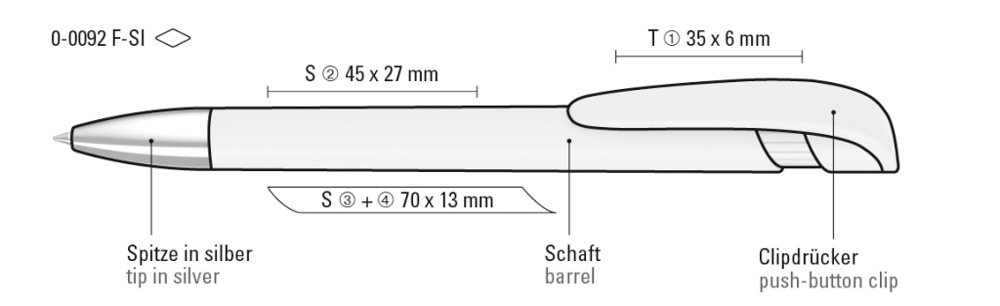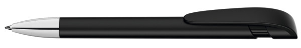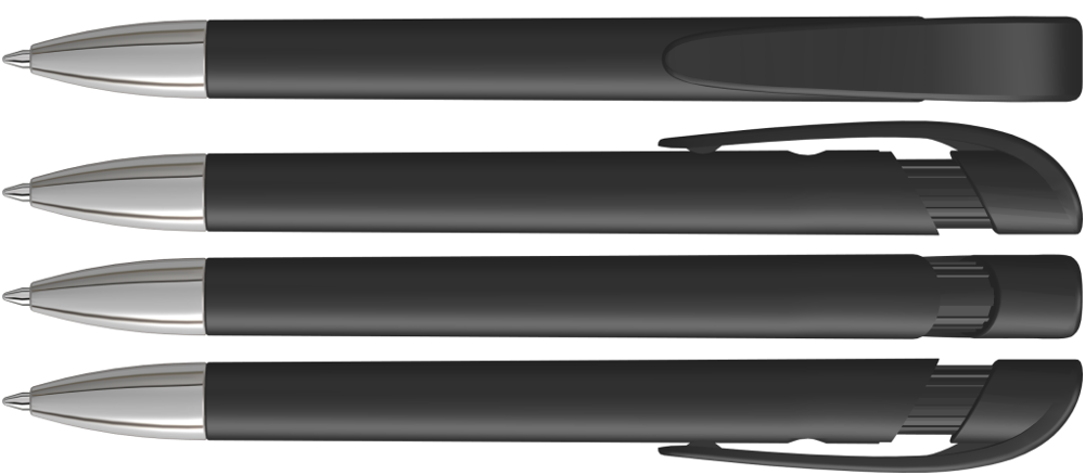 Druckkugelschreiber mit gedeckt mattem Gehäuse, breitem Bogenclipdrücker und silberner Spitze glanzverchromt.