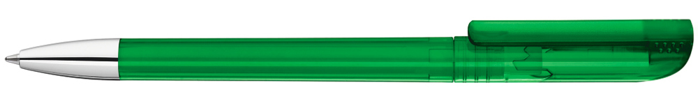 Drehkugelschreiber mit transparent glänzendem Gehäuse, gefrosteter Clipoberfläche und Spitze glanzverchromt.