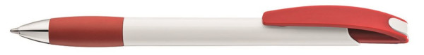 Druckkugelschreiber mit gedeckt glänzendem Gehäuse in weiß, farbiger Gummigriffzone und Clipdrücker. Drückerstopfen und Spitze in silber glänzend.