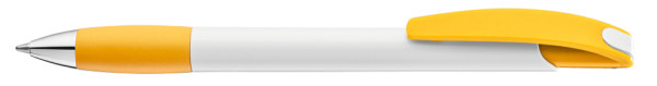 Druckkugelschreiber mit gedeckt glänzendem Gehäuse in weiß, farbiger Gummigriffzone und Clipdrücker. Drückerstopfen und Spitze in silber glänzend.