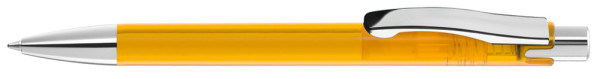 Druckkugelschreiber mit transparent glänzendem Gehäuse, schwerer Metallspitze, Metalldrücker und Metallclip glanzverchromt.