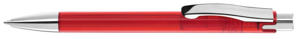 Druckkugelschreiber mit transparent glänzendem Gehäuse, schwerer Metallspitze, Metalldrücker und Metallclip glanzverchromt.