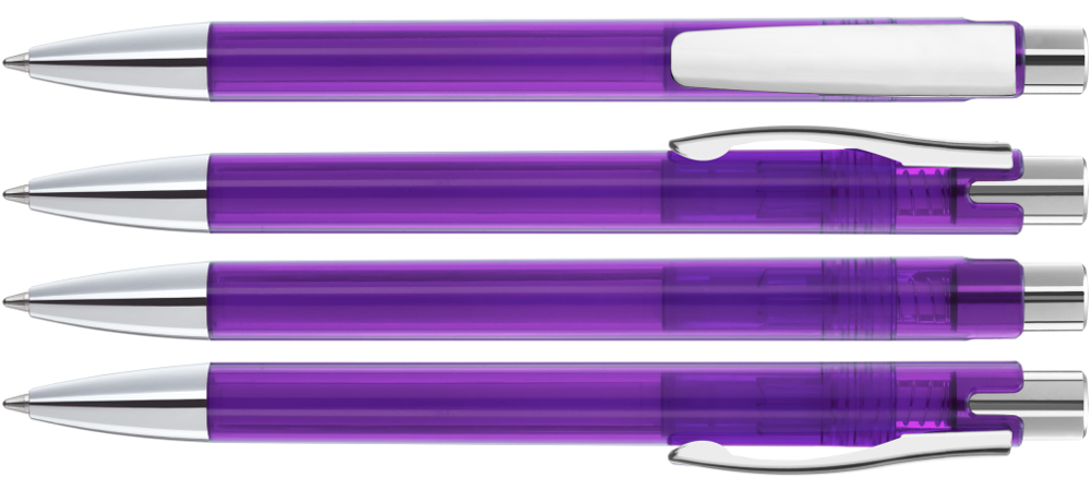 Druckkugelschreiber mit transparent glänzendem Gehäuse, schwerer Metallspitze, Metalldrücker und Metallclip glanzverchromt.