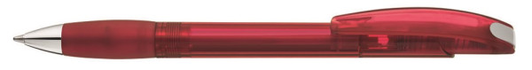 Druckkugelschreiber mit transparent glänzendem Gehäuse, Gummigriffzone und Clipdrücker. Drückerstopfen und Spitze silber glänzend.