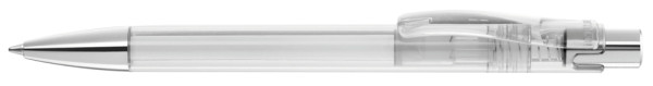Druckkugelschreiber mit transparent glänzendem Gehäuse, Metalldrücker und schwerer Metallspitze glanzverchromt.