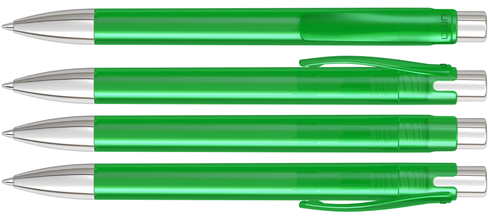 Druckkugelschreiber mit transparent glänzendem Gehäuse, Metalldrücker und schwerer Metallspitze glanzverchromt.