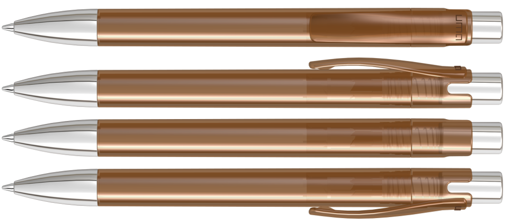 Druckkugelschreiber mit transparent glänzendem Gehäuse, Metalldrücker und schwerer Metallspitze glanzverchromt.