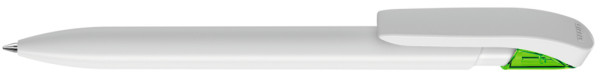 Druckkugelschreiber mit gedeckt glänzendem Gehäuse in uni weiß oder schwarz und farbig transparent glänzende Manschette.