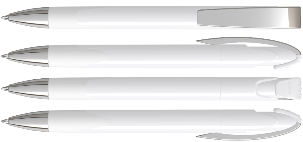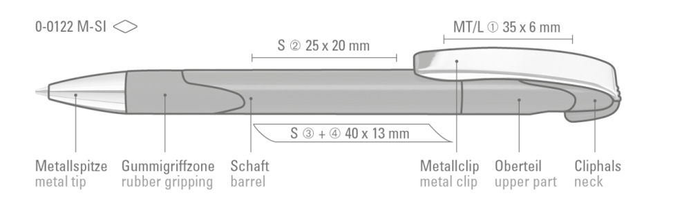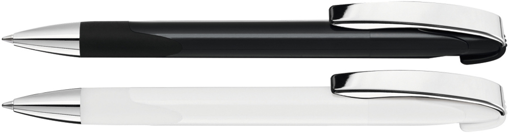 Druckkugelschreiber mit gedeckt glänzendem Gehäuse, Gummigriffzone, schwerer Metallspitze und Metallclip glanzverchromt.