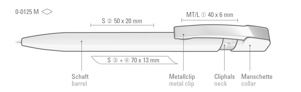 Druckkugelschreiber mit gedeckt glänzendem Gehäuse in uni weiß oder schwarz und farbig transparent glänzendem Cliphals, flexiblem Metallclip glanzverchromt.