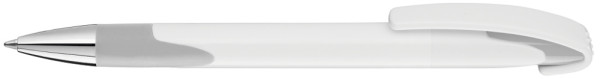 Druckkugelschreiber mit gedeckt glänzendem Gehäuse, Gummigriffzone und schwerer Metallspitze glanzverchromt.