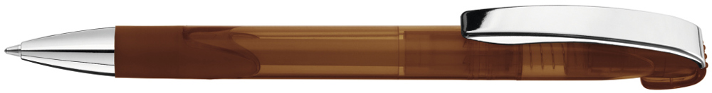 Druckkugelschreiber mit transparent glänzendem Gehäuse, Gummigriffzone, schwerer Metallspitze und Metallclip glanzverchromt.