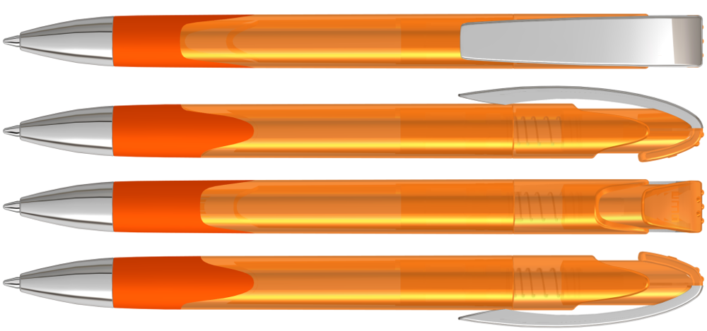 Druckkugelschreiber mit transparent glänzendem Gehäuse, Gummigriffzone, schwerer Metallspitze und Metallclip glanzverchromt.