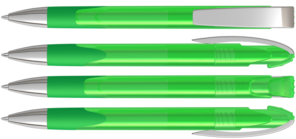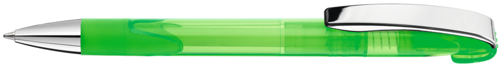 Druckkugelschreiber mit transparent glänzendem Gehäuse, Gummigriffzone, schwerer Metallspitze und Metallclip glanzverchromt.