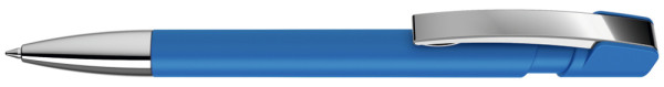 Druckkugelschreiber mit Softtouch-Gehäuse, flexiblem Metallclip und schwerer Metallspitze glanzverchromt.