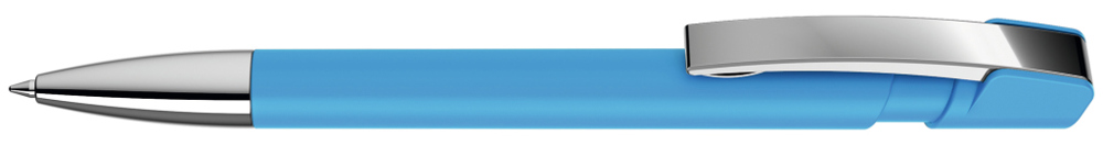 Druckkugelschreiber mit Softtouch-Gehäuse, flexiblem Metallclip und schwerer Metallspitze glanzverchromt.