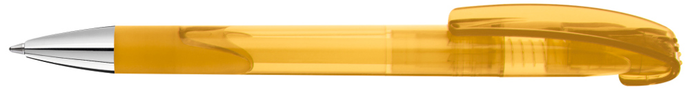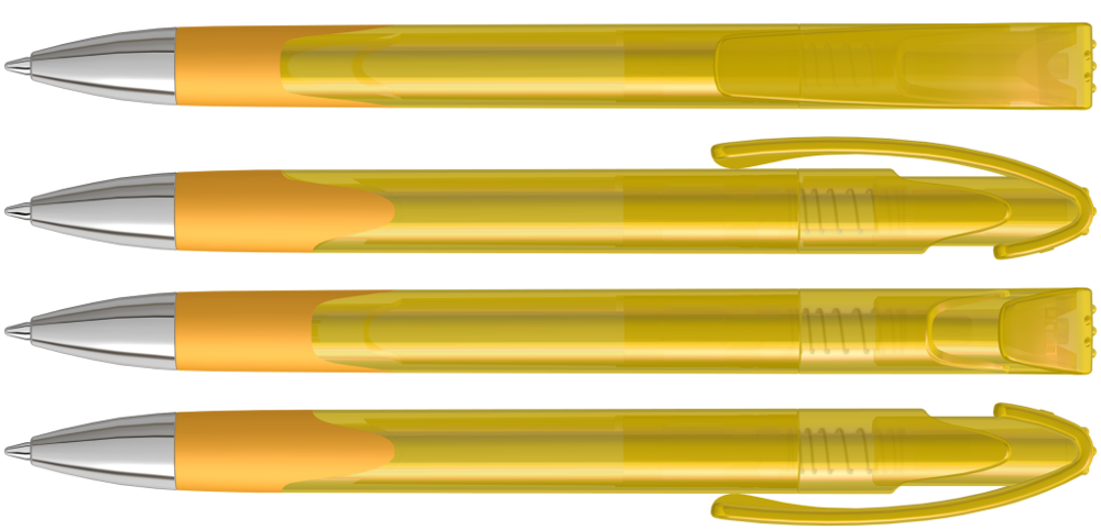 Druckkugelschreiber mit transparent glänzendem Gehäuse, Gummigriffzone und schwerer Metallspitze glanzverchromt.