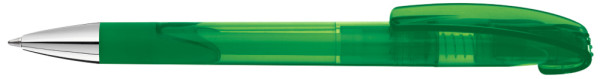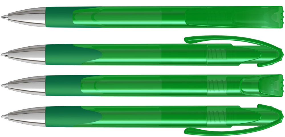 Druckkugelschreiber mit transparent glänzendem Gehäuse, Gummigriffzone und schwerer Metallspitze glanzverchromt.