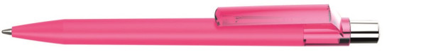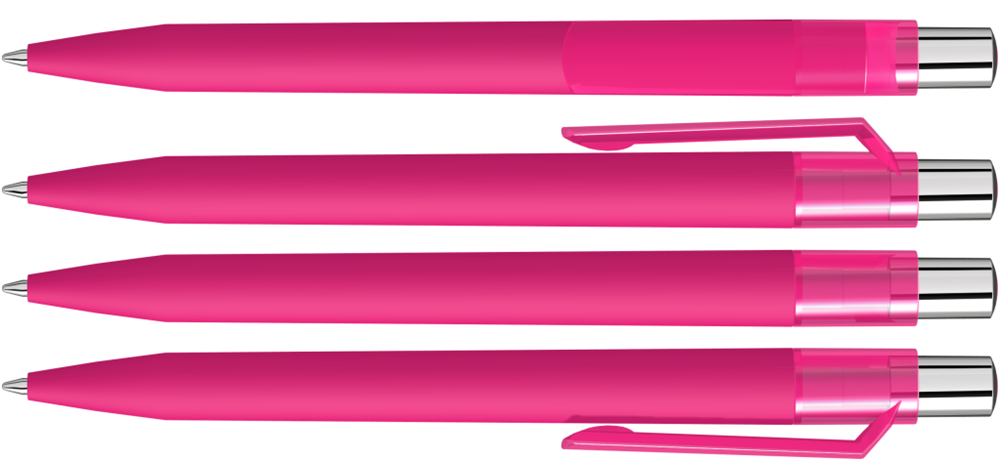 Druckkugelschreiber mit Softtouch-Schaft, transparent glänzendem Clip, silber glänzendem Drücker und farbigem Stopfen.