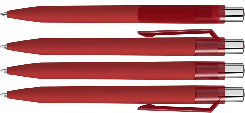 Druckkugelschreiber mit Softtouch-Schaft, transparent glänzendem Clip, silber glänzendem Drücker und farbigem Stopfen.