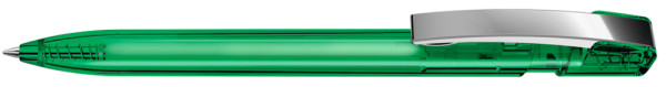 Druckkugelschreiber mit transparent glänzendem Gehäuse und flexiblem Metallclip glanzverchromt.