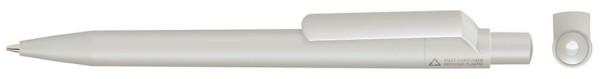 Druckkugelschreiber mit gedeckt mattem Gehäuse, Clip, Drücker und Stopfen aus 100% recyceltem Post-Consumer-Kunststoff.