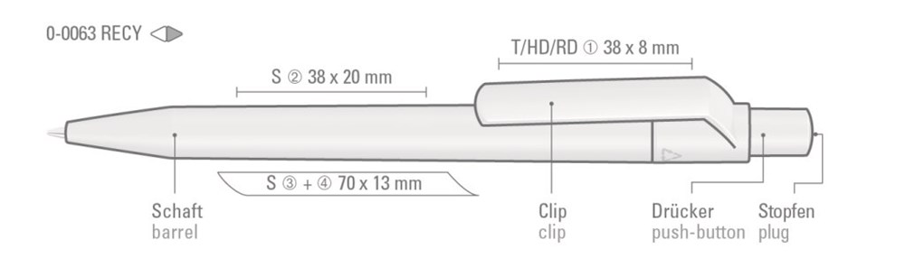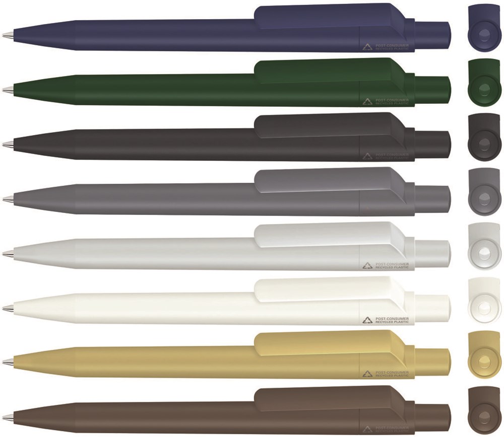 Druckkugelschreiber mit gedeckt mattem Gehäuse, Clip, Drücker und Stopfen aus 100% recyceltem Post-Consumer-Kunststoff.