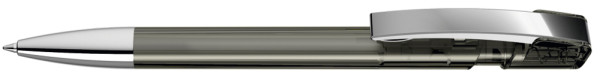Druckkugelschreiber mit transparent glänzendem Gehäuse, flexiblem Metallclip und schwerer Metallspitze glanzverchromt.
