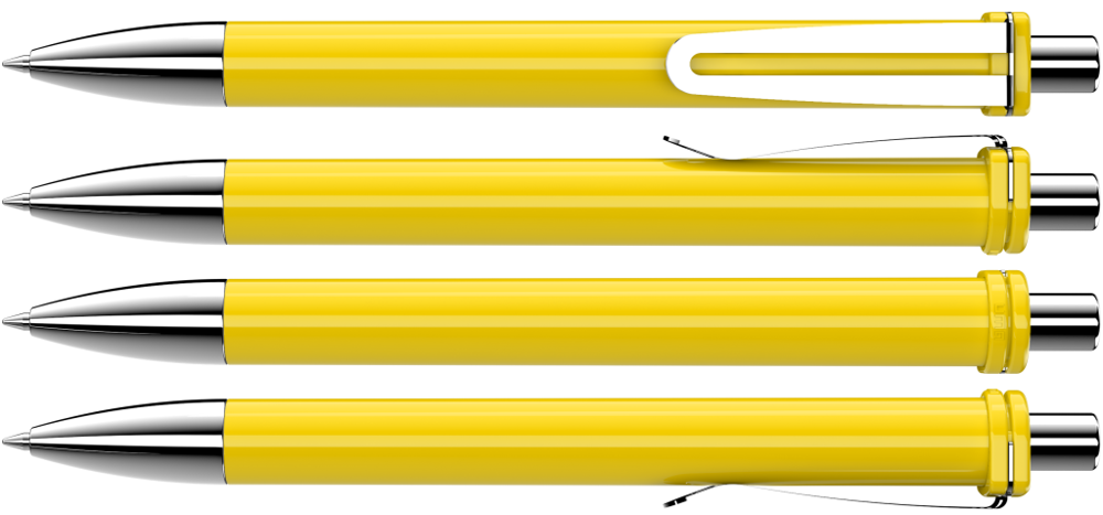 Druckkugelschreiber mit gedeckt glänzendem Schaft und Clipaufhängung. Breiter Metallbiegeclip, Metallspitze und Metalldrücker glanzverchromt.
