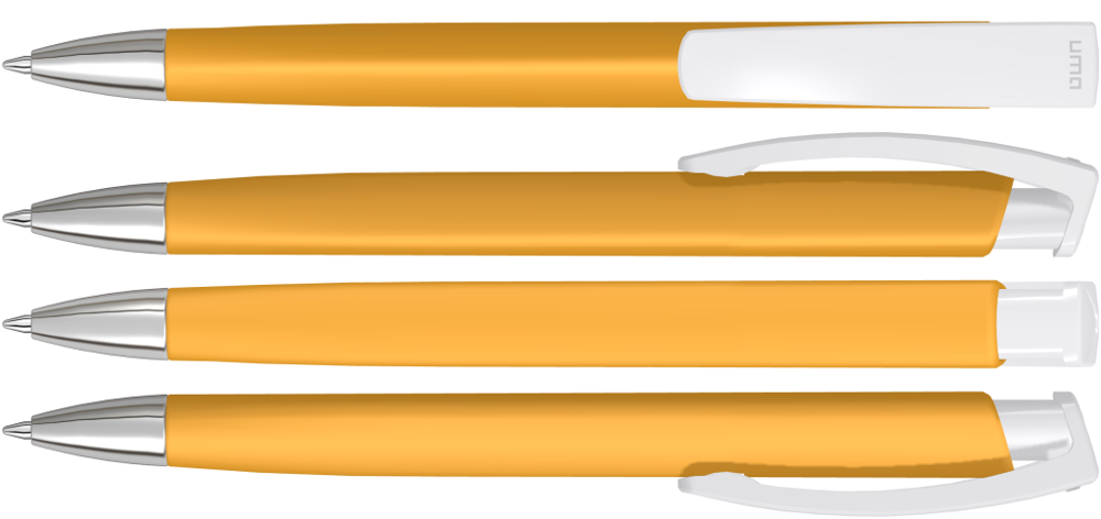 Druckkugelschreiber mit gummiertem Dreikantgehäuse, weiß gedeckt glänzendem Clip und schwerer Metallspitze glanzverchromt.