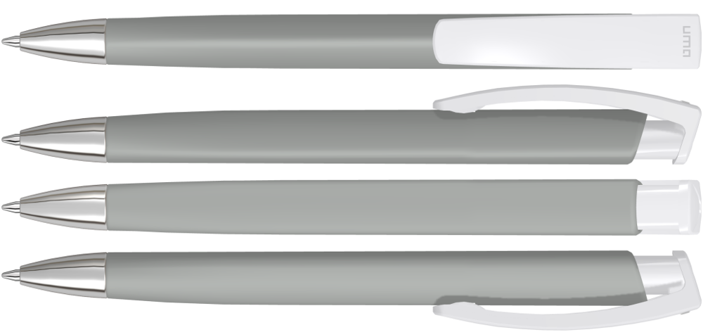 Druckkugelschreiber mit gummiertem Dreikantgehäuse, weiß gedeckt glänzendem Clip und schwerer Metallspitze glanzverchromt.