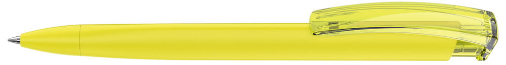Druckkugelschreiber mit gummiertem Dreikantgehäuse und transparent glänzendem Clip.