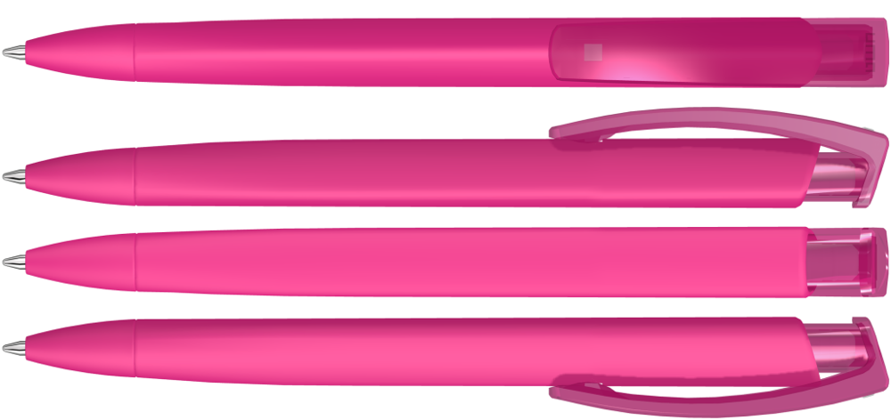 Druckkugelschreiber mit gummiertem Dreikantgehäuse und transparent glänzendem Clip. mehr