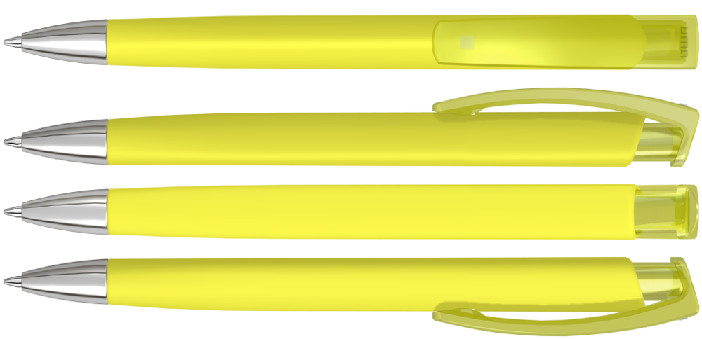 Druckkugelschreiber mit gummiertem Dreikantgehäuse, transparent glänzendem Clip und schwerer Metallspitze glanzverchromt.