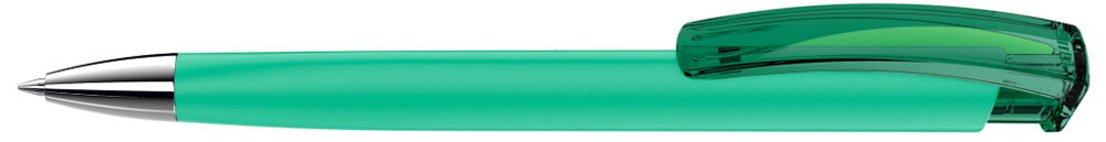 Druckkugelschreiber mit gummiertem Dreikantgehäuse, transparent glänzendem Clip und schwerer Metallspitze glanzverchromt.