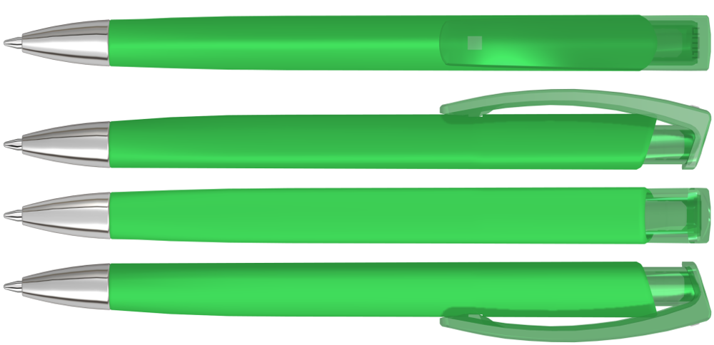 Druckkugelschreiber mit gummiertem Dreikantgehäuse, transparent glänzendem Clip und schwerer Metallspitze glanzverchromt.