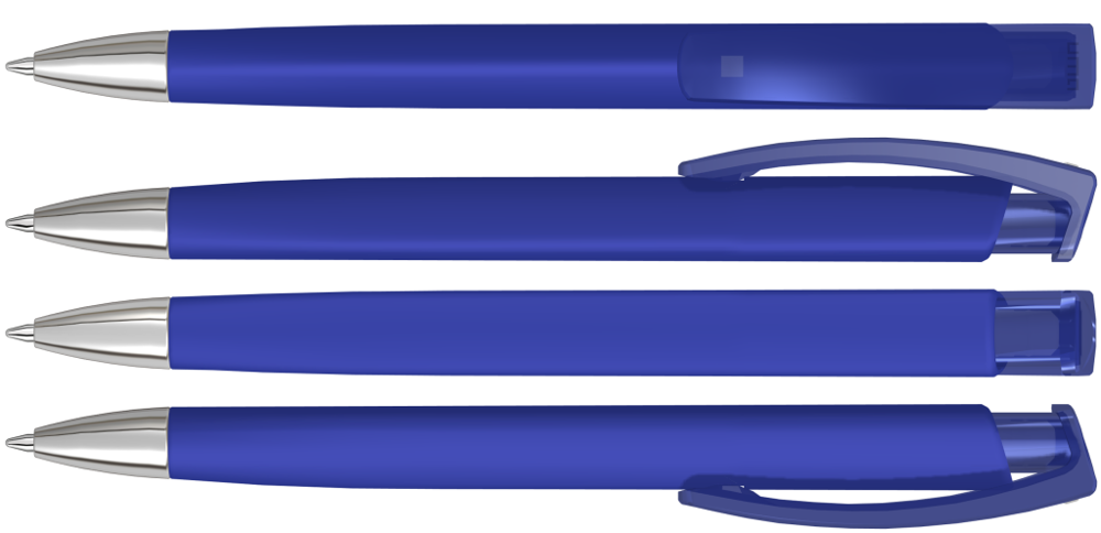 Druckkugelschreiber mit gummiertem Dreikantgehäuse, transparent glänzendem Clip und schwerer Metallspitze glanzverchromt.