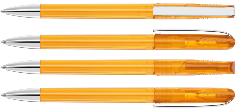 Drehkugelschreiber mit glänzend transparentem Gehäuse, schwerer Metallspitze und Metallclip. Griffnoppen in der Kappe unterstützen den komfortablen Drehmachanismus.