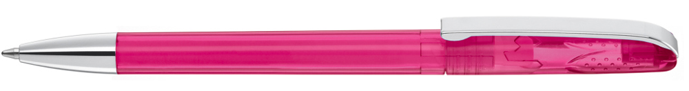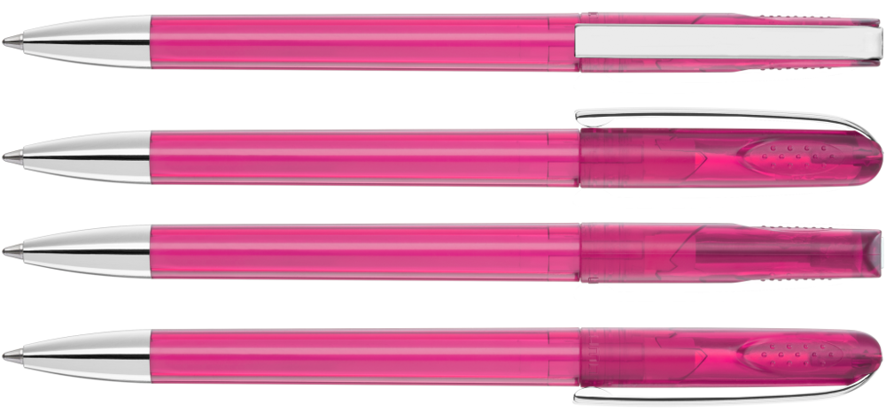 Drehkugelschreiber mit glänzend transparentem Gehäuse, schwerer Metallspitze und Metallclip. Griffnoppen in der Kappe unterstützen den komfortablen Drehmachanismus.