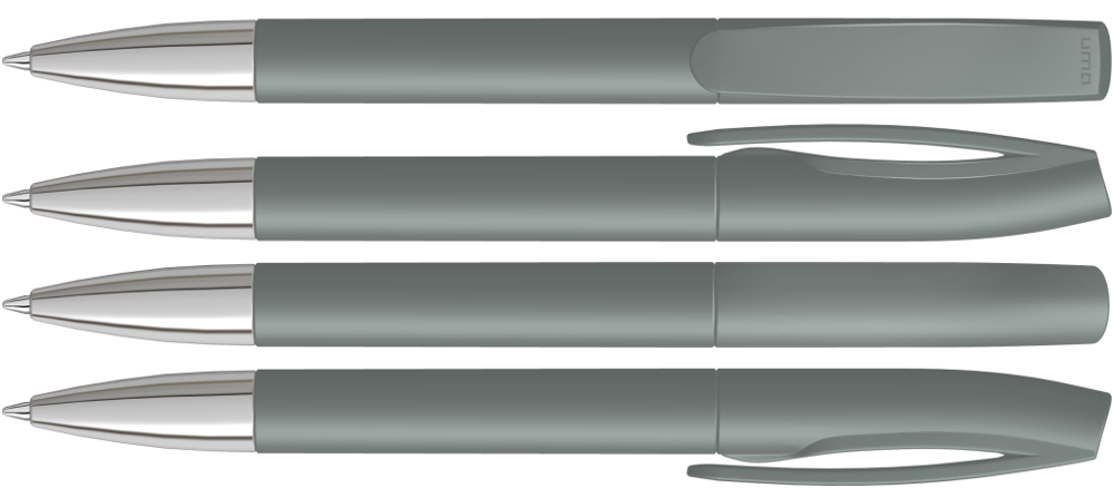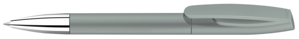 Drehkugelschreiber mit matt gedecktem Gehäuse und silberner Spitze glanzverchromt.