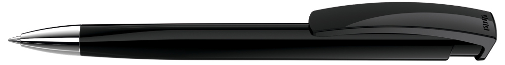 Druckkugelschreiber mit gedeckt glänzendem Dreikantgehäuse und schwerer Metallspitze glanzverchromt.