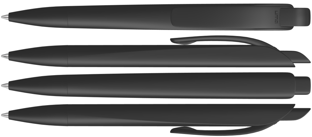 Druckkugelschreiber mit geometrisch wechselnder Schaftform. Gehäuse gedeckt matt schwarz oder weiß mit Bogenclip und farbigem Drücker.