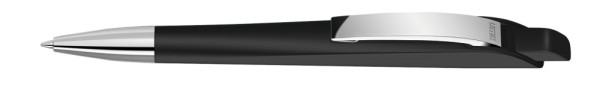 Druckkugelschreiber mit geometrisch wechselnder Schaftform. Gehäuse und Drücker gedeckt matt, Metallclip und Metallspitze glanzverchromt.