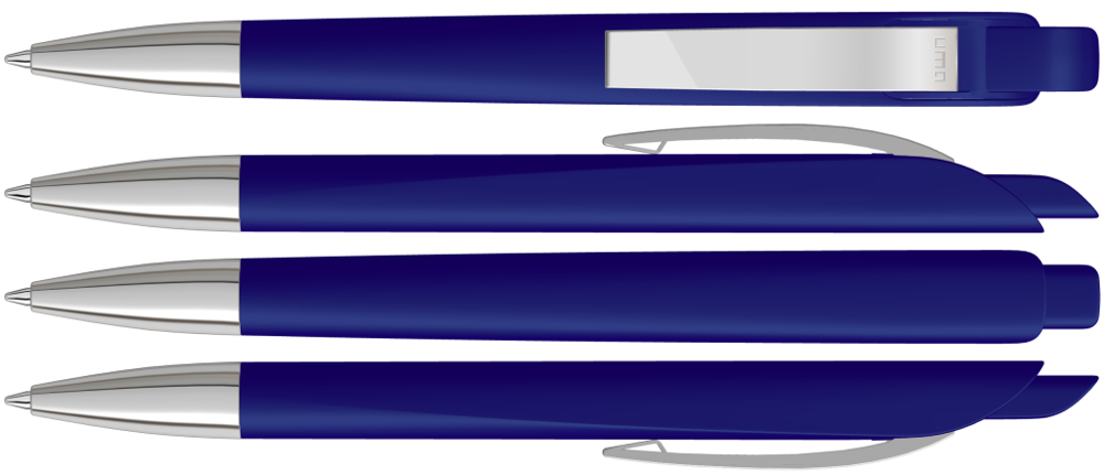 Druckkugelschreiber mit geometrisch wechselnder Schaftform. Gehäuse und Drücker gedeckt matt, Metallclip und Metallspitze glanzverchromt.
