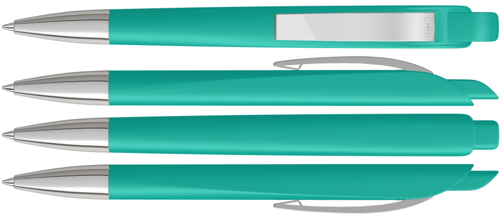Druckkugelschreiber mit geometrisch wechselnder Schaftform. Gehäuse und Drücker gedeckt matt, Metallclip und Metallspitze glanzverchromt.