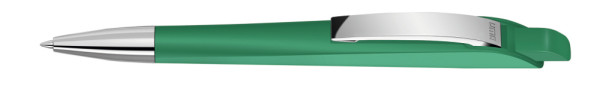 Druckkugelschreiber mit geometrisch wechselnder Schaftform. Gehäuse und Drücker gedeckt matt, Metallclip und Metallspitze glanzverchromt.