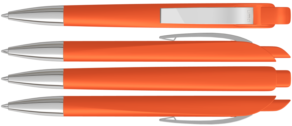 Druckkugelschreiber mit geometrisch wechselnder Schaftform. Gehäuse und Drücker gedeckt matt, Metallclip und Metallspitze glanzverchromt.