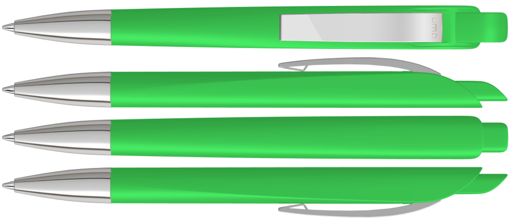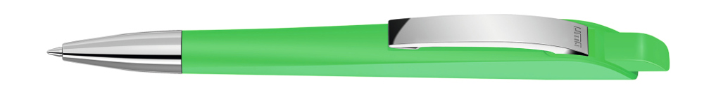 Druckkugelschreiber mit geometrisch wechselnder Schaftform. Gehäuse und Drücker gedeckt matt, Metallclip und Metallspitze glanzverchromt.